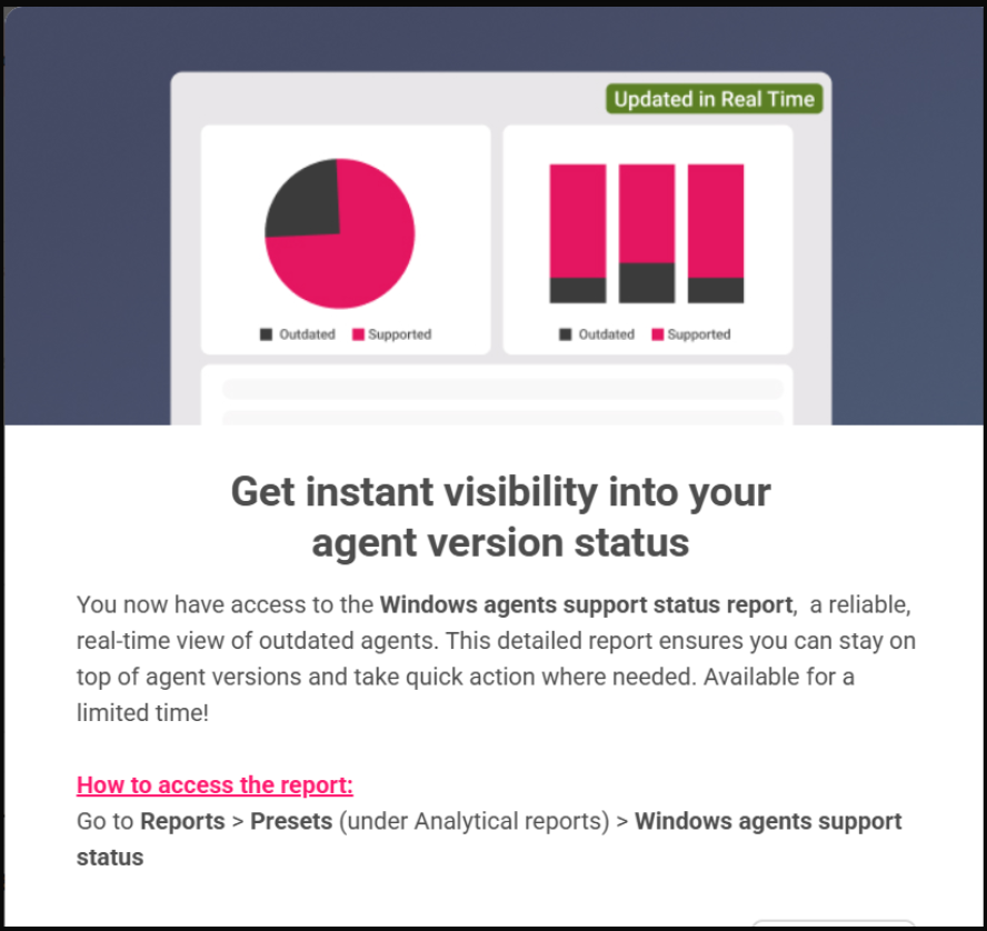 Good news! We’ve put together a brand-new preset analytical report to make it easier for you to filter agents by Site/Customer and quickly spot which versions are supported and which are outdated.